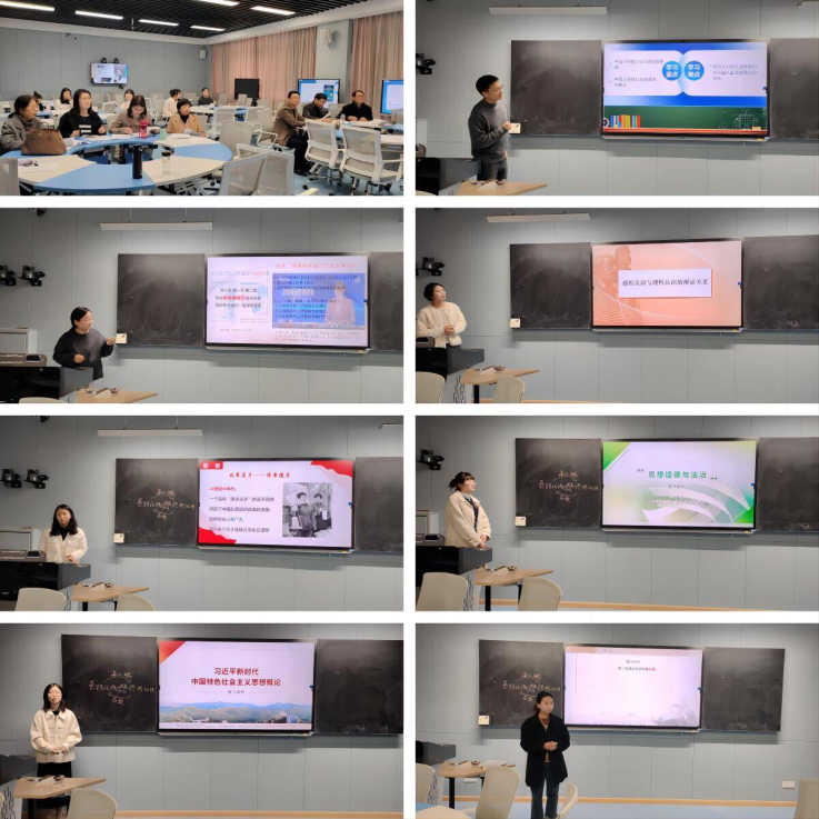 比赛内容为1个教学片段的教学设计和相应的课堂教学展示,两个部分分别为20分和80分。刘佳老师主讲的是《中国近现代史纲要》课程,他采用案例分析的方法,启发学生思考“抗日战争的胜利及其意义”;董慧敏老师主讲课程为《习近平新时代中国特色社会主义思想概论》,她通过视频“我国新能源汽车产量首破1000万辆”导入课程,引导学生总结出新发展理念的表现,有效帮助学生理解“贯彻新发展理念是关系我国发展全局的一场深刻变革”;冯帆老师主讲的课程是《马克思主义基本原理》,她利用图片背后的故事提出问题,结合大量生活实际的鲜活事例,生动诠释了“感性认识与理性认识的辩证关系”;王亚洋老师主讲的课程是《毛泽东思想和中国特色社会主义理论体系概论》,她运用图片、实物、视频等直观材料展示,生动活泼地阐述了“邓小平理论首要的基本的理论问题”;姚宇晨老师主讲《思想道德与法治》,她落实OBE教育理念原则,通过情景教学方法,将“道德的起源和本质”讲解得通俗易懂;王景婷老师主讲的课程是《习近平新时代中国特色社会主义思想概论》,她以问题为导向、以现实为切口,将大班教学与小组讨论结合起来,让同学深刻认识到中国式现代化与西方现代化的不同,对“中国式现代化是一种什么样的现代化”有着清晰的认识;万思贤老师的主讲课程是《中国近现代史纲要》,她创造性地运用“读-思-悟-融-通”五步立体混合式教学模式,深入浅出地以粮食为线索,讲解了中国共产党全面抗战中的群众动员。