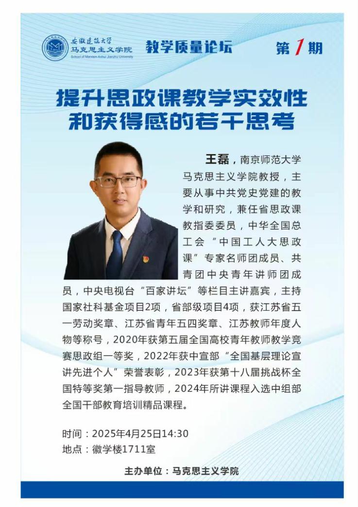 【专家简介】王磊:全国高校青年教师教学竞赛思政组一等奖获得者、全国基层理论宣讲先进个人,中华全国总工会“中国工人大思政课”专家名师团成员、共青团中央青年讲师团成员,中央电视台“百家讲坛”等栏目主讲嘉宾,获江苏省五一劳动奖章、江苏省青年五四奖章、江苏教师年度人物等称号。主持国家社科基金项目2项,省部级项目4项,2023年获第十八届挑战杯全国特等奖第一指导教师,2024年所讲课程入选中组部全国干部教育培训精品课程。
