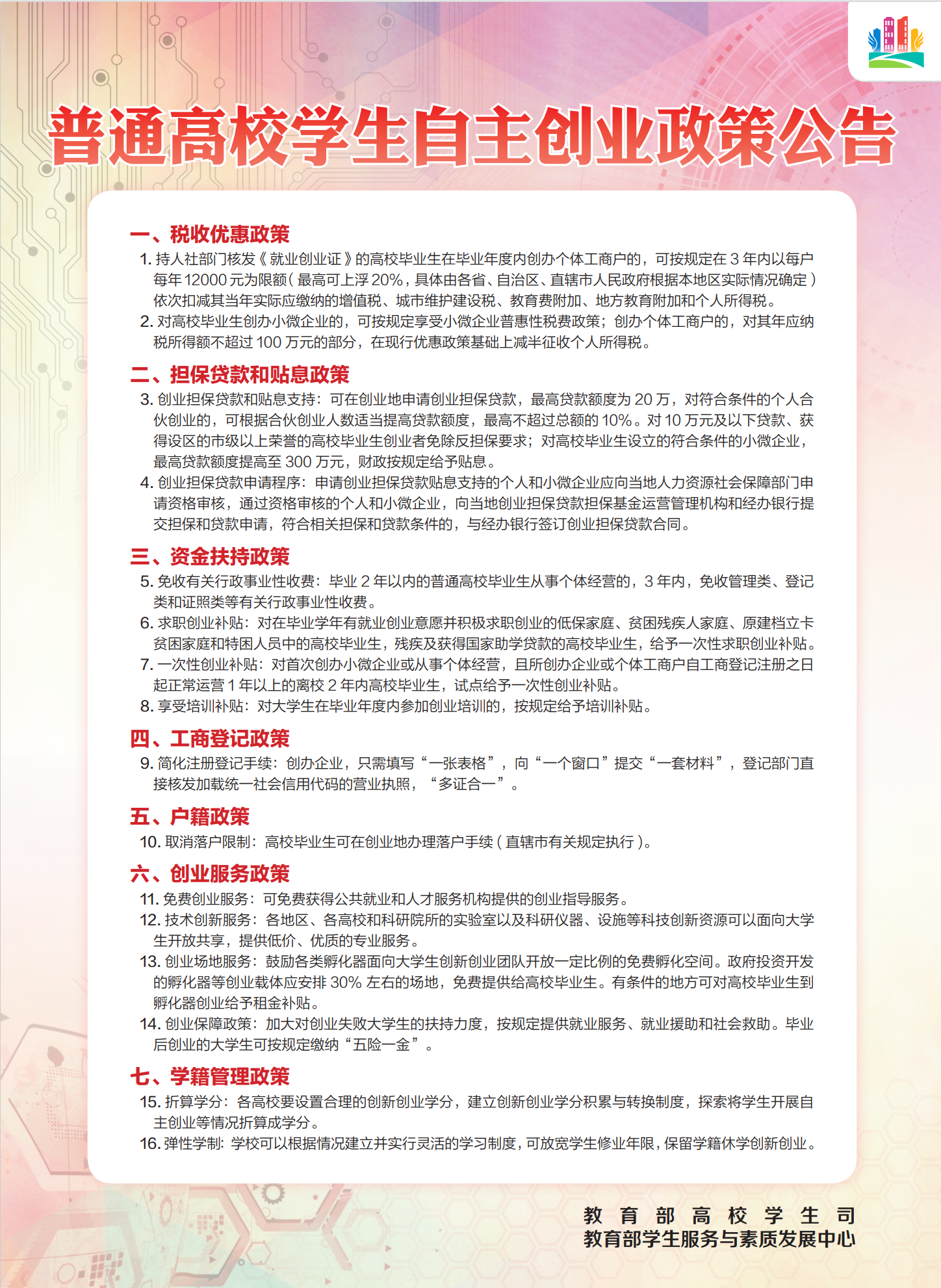 普通高校学生自主创业政策公告