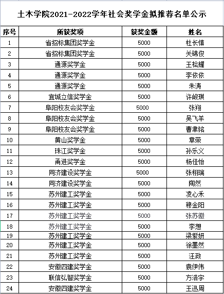 经个人申请、班级评议与学院审核,土木学院2021-2022学年社会奖学金推荐名单如下,现予以公示,公示期自2022年12月5日至12月9日。