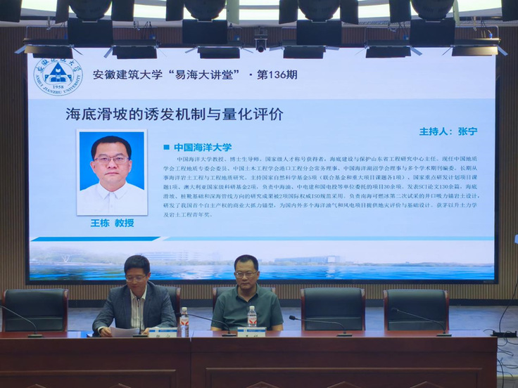 本网讯 10月15日下午,由校党委宣传部主办,土木工程学院、安徽省智能地下探测重点实验室承办的第136期“易海大讲堂”在南校区徽智楼(国土大数据中心)一楼报告厅举行。中国海洋大学王栋教授为全校师生做题为《海底滑坡的诱发机制与量化评价》的精彩报告。报告会由土木工程学院院长张宁教授主持,相关专业教师和研究生参加了本次报告会。