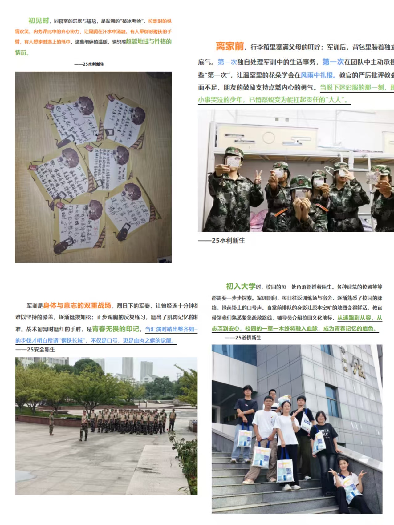 军训是新生迈入大学的第一课,也是锤炼意志、磨砺品格的重要契机。活动自启动以来,得到了 2025 级新生的积极响应,大家踊跃投稿,用镜头定格军训中的精彩瞬间,用文字记录校园生活的点滴感悟。一幅幅定格军训瞬间的照片、一段段记录训练日常的视频,将观众带回烈日下的训练场。站军姿时挺拔如松的身影、战术匍匐时磨红的肘部、拉歌比赛中震天的歌声……新生们用镜头和文字记录下军训的点滴:有人写下“正步踢腿从生疏到精准,是肌肉记忆的觉醒,更是意志的磨砺”;有人用照片捕捉战友搀扶晕倒同伴的温暖瞬间;还有人以视频呈现方阵汇演时整齐划一的步伐,配文“钢铁长城,不仅是口号,更是血肉之躯的觉醒”。每一份作品都饱含着新生们对青春的热爱与对未来的期许。活动共评选出一等奖6名、二等奖12名、三等奖15名。