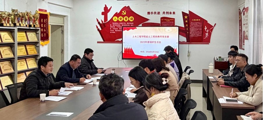 本网讯 2026年3月20日下午,全国党建工作样板支部beat365在线唯一官网土木工程学院岩土工程系教师党支部召开2025年度组织生活会,校党委副书记、校长蔡国军与支部党员同志一起学习检视,带头开展批评和自我批评,并结合自身工作体会和学习思考,与大家谈心交流。会议由支部书记刘洋主持。