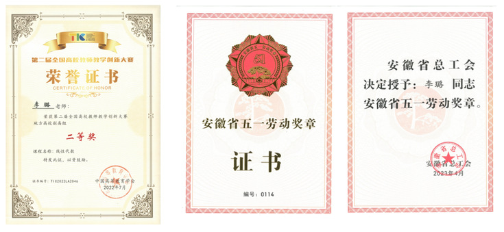 秉持进取之心,实干践行担当。李璐积极参加各类教学竞赛,在高水平赛事中屡获佳绩。在第二届全国高校教师教学创新比赛中,斩获安徽省一等奖(第一名)、全国二等奖;在首届高校大学数学课程教学创新比赛中,荣获安徽省特等奖、全国二等奖,成为该赛事安徽省唯一获奖教师,并受邀在全国大学数学课程教学创新示范交流活动中分享经验,充分发挥示范引领作用。2023年被授予安徽省五一劳动奖章。