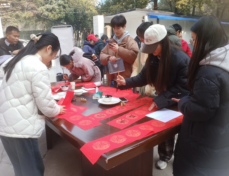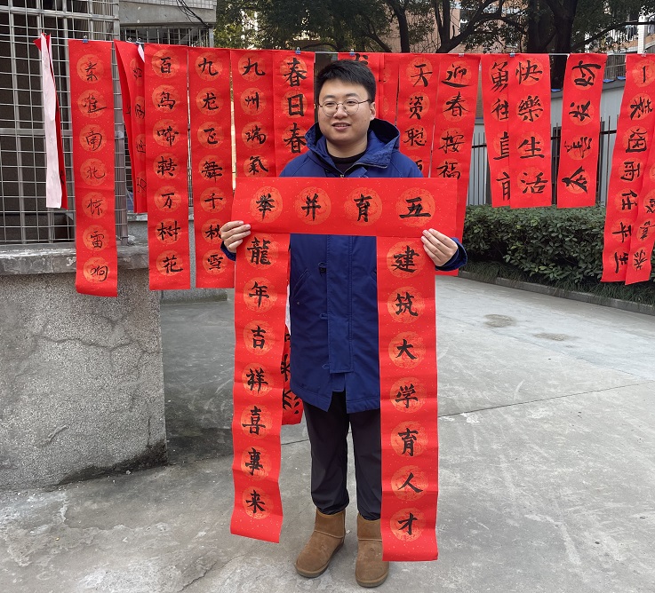 一墨一砚一宣纸,一字一句一名言,书法用自己的方式传承着中华传统文化的独特魅力,北区在活动现场摆上办公桌,准备好笔墨纸砚,同学们在现场挥毫泼墨,写下了一副副春联,毛笔起起落落挥洒出青春的风采,火红的纸张在老师和同学们的字字句句中有了神韵。“龙年吉祥喜事来 建筑大学育人才”“百鸟啼转万树花 九龙飞舞千秋雪”、“迎新年百福呈祥 辞旧岁家业兴旺”……一句句喜庆吉祥的祝福被写在洒金红纸上,展现出对幸福生活的追求与祝福,也有平安吉祥、和谐发展的美好寓意。