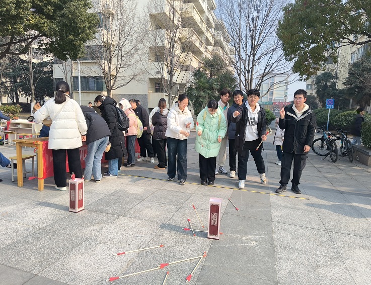 投壶,是我国一种传统投掷游戏,也是一种传统礼仪。据有关资料记载,投壶最早起源于射礼,在战国时期较为盛行,尤其是在唐朝,得到了发扬光大,成了平民百姓日常的一种娱乐消遣。通过一定规则,将手中箭矢投入“壶”中,既能锻炼大脑判断能力,还能考验身体协调性和心理素质,在两人角逐的过程中,赛事跌宕起伏,调拨着选手与观众心弦,现场投壶项目吸引了同学们的热情参与和围观,投进一支呼声四起,现场气氛欢乐和谐。