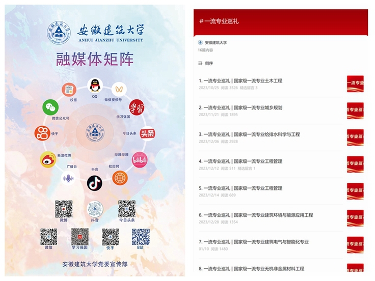 策划专题报道,彰显优势。瞄准学校改革发展进程中在人才培养、科学研究、社会服务、文化传承中的闪光点,聚焦平凡岗位、暖心事迹等,做强做优榜样建大、微光安建、领航建大人等品牌栏目,开展“顶天立地”专题宣传。相关栏目共发布宣传报道295篇,阅读量超5万。招生季推出“一流专业巡礼”报道专栏,推荐学校国家级、省级一流专业27个,相关文章及视频在全网阅读量突破20万,为促进学校优质生源和人才培养质量稳步增长,提升学校社会影响力和美誉度贡献宣传力量。
