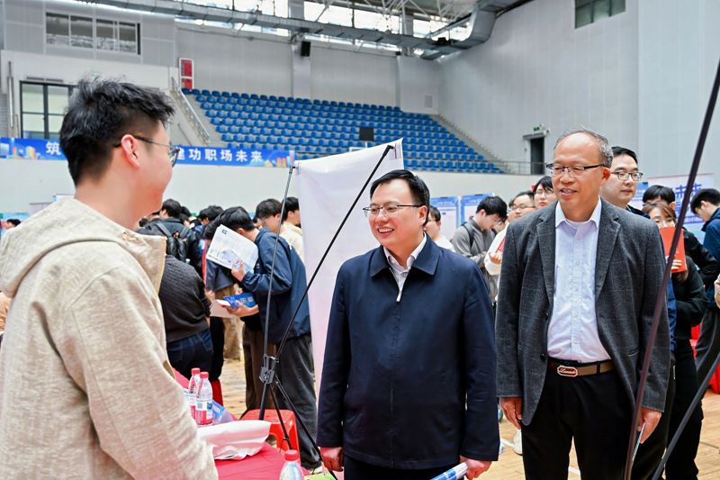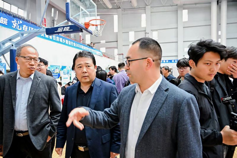 本网讯 为深入贯彻落实省委省政府“人才兴皖”战略部署,精准对接住房城乡建设行业人才需求与高校毕业生就业需求,4月8日,由省住房和城乡建设厅、省教育厅联合主办,学校承办的“人才兴皖、‘就’在江淮”安徽省住房城乡建设行业2026届高校毕业生春季专场招聘会在紫云路校区体育馆成功举行。省住房和城乡建设厅党组成员、副厅长尹宗军,省大中专毕业生就业指导中心主任张秋田,校党委书记马文革,党委副书记李早,党委常委、副校长杨科,党委常委、副校长王佐才现场指导。