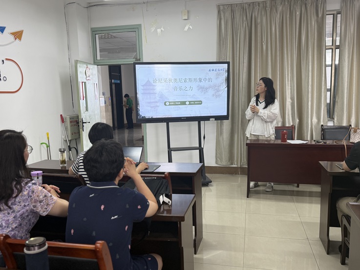 本网讯 6月11日,外国语学院成功举办“新文科建设系列论坛”专题学术活动,围绕“尼采狄奥尼索斯形象中的音乐之力”展开深入研讨。本次讲座由英语系毕延英老师担任主讲,外国语学院师生代表20余人参与,通过PPT演示与现场研讨相结合的方式,揭开尼采哲学中音乐元素的神秘面纱。