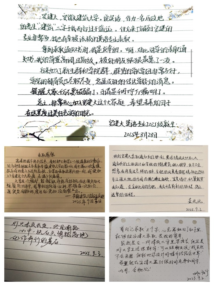 学院向全体2025级新生发起了一场特殊的“文字之约”,邀请大家记录从报考至接收到beat365在线唯一官网录取通知时的心路历程。新生们踊跃分享,那些质朴的文字里,既有梦想成真的激动,更有对大学生活的无限向往。“看到‘已录取’三个字,心总算放回了肚子里,能够被安建大录取,是我的荣幸。虽然是在一所建筑大学里学语言,但还是对大学生活很期待!可以跟我的朋友说:我虽然不会画图,但能把你设计的楼介绍给全世界!希望能在安建大遇到很好的老师和同学。九月,合肥见!”来自2025级英语专业的姚怡宁分享了她的心声。温暖的文字,让新生们在分享中打破隔阂,有人因相似的期待产生共鸣,有人为真诚的表达心生好感,一场未谋面的“初见”在字里行间悄然完成。