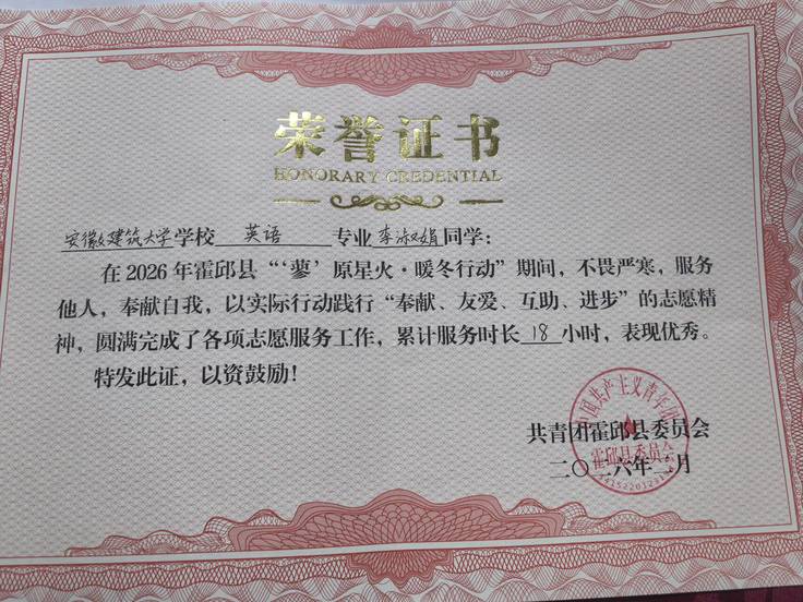 25级英语专业李淑娟同学利用假期时间,主动报名成为霍邱县人民医院南院区的一名志愿者,用耐心与细心为医护工作添砖加瓦。实践期间,她坚守在门诊引导、病历整理、患者咨询等岗位,主动协助医护人员引导患者有序就诊、讲解就诊流程,耐心解答群众关于挂号、取药、检查等方面的疑问,缓解了医院就诊高峰期的工作压力。面对行动不便的患者,她主动上前搀扶、协助办理相关手续,用温暖的话语安抚患者情绪,用点滴行动传递青春温情。在工作日志中,她这样写到“这段志愿经历让我深刻体会到医护人员的坚守与不易,也让我明白,平凡的岗位也能传递温暖、创造价值”。