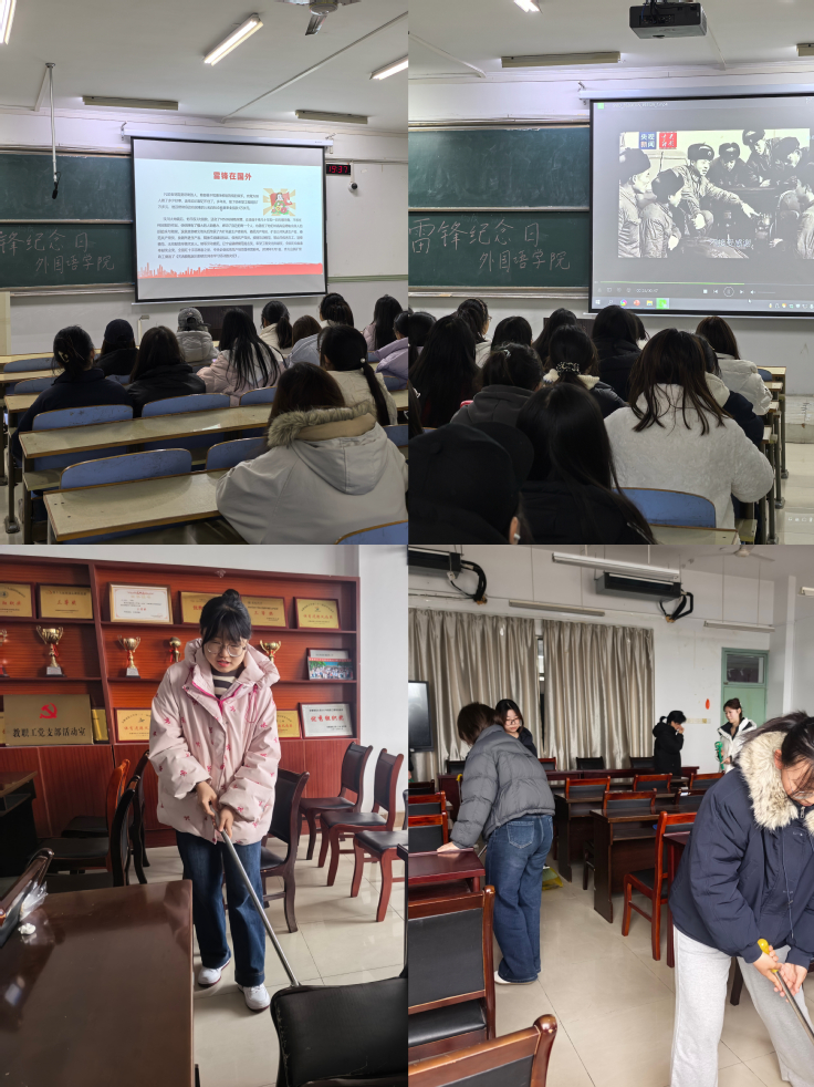 学院高度重视,组织召开雷锋精神主题学习会,师生们共同学习雷锋事迹、感悟雷锋精神的时代价值。会上,25级英语专业2班团支书耿佳悦围绕“雷锋在国外”等主题展开分享,详细讲述了雷锋精神在国际社会的传播与影响,让大家深刻认识到雷锋精神不仅是中国的宝贵财富,更成为全人类共同的价值追求。随后,师生们共同观看雷锋主题纪录片,通过影像资料重温雷锋“干一行爱一行”的敬业精神和奉献情怀,进一步凝聚起向雷锋同志学习的思想共识。最后,学院组织学生志愿者开展校园环境清洁志愿服务活动。志愿者们手持清洁工具,对教职工党支部活动室等区域进行了细致清扫,擦拭桌椅、清理地面、整理物品,以不怕脏、不怕累的实际行动,践行雷锋同志“螺丝钉”般的奉献精神。整洁明亮的环境不仅美化了校园空间,更让志愿者们在劳动中体会到服务他人、奉献社会的快乐,让雷锋精神在实践中焕发新的生机。