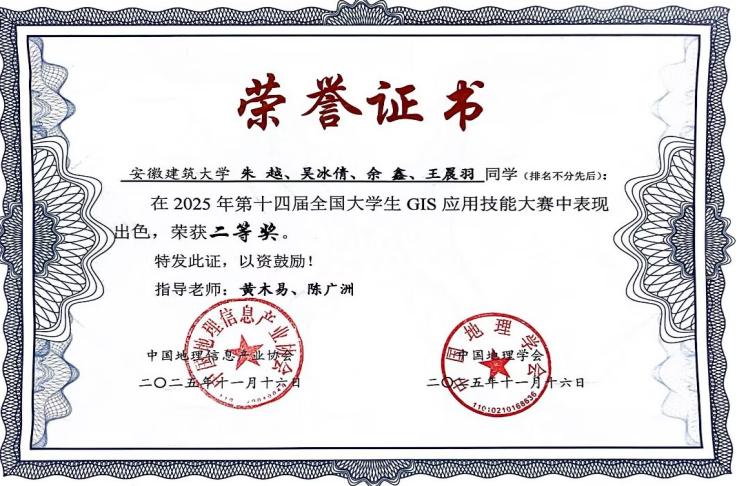 本网讯 近日,第十四届全国大学生GIS应用技能大赛在西安科技大学成功举办。环能学院黄木易、陈广洲教授指导的2022级和2023级地理信息科学专业本科生朱越、吴冰倩、余鑫和王晨羽组成的代表队参加了比赛,荣获全国二等奖。