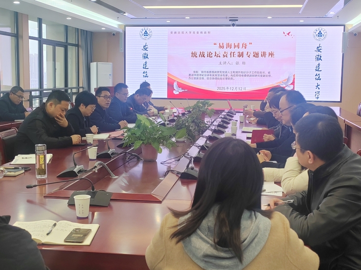 本网讯 为深入学习贯彻习近平总书记关于做好新时代党的统一战线工作的重要思想,全面落实统战工作相关规定要求,进一步健全工作责任体系,提升全校统战工作科学化、规范化水平。近日,学校“易海同舟”统战论坛特邀省委统战部无党派人士和党外知识分子工作处张标处长作统战工作责任制专题讲座。学校统战工作领导小组成员单位负责人、二级单位统战委员及相关工作人员参加学习。