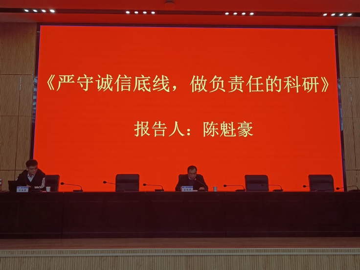 本网讯 为进一步弘扬科学家精神,营造风清气正、求真务实的良好科研生态。近日,学校在徽风楼二楼报告厅举办科研诚信辅导讲座,邀请宁波大学陈魁豪教授作题为《严守诚信底线,做负责任的科研》的专题报告。校党委常委、副校长王佐才主持会议。各学院相关领导、近三年新进博士、在站博士后、科研平台负责人、创新团队负责人、教师代表,科学技术处、科技成果转化处、发展规划处、人事处相关人员参加本次会议。