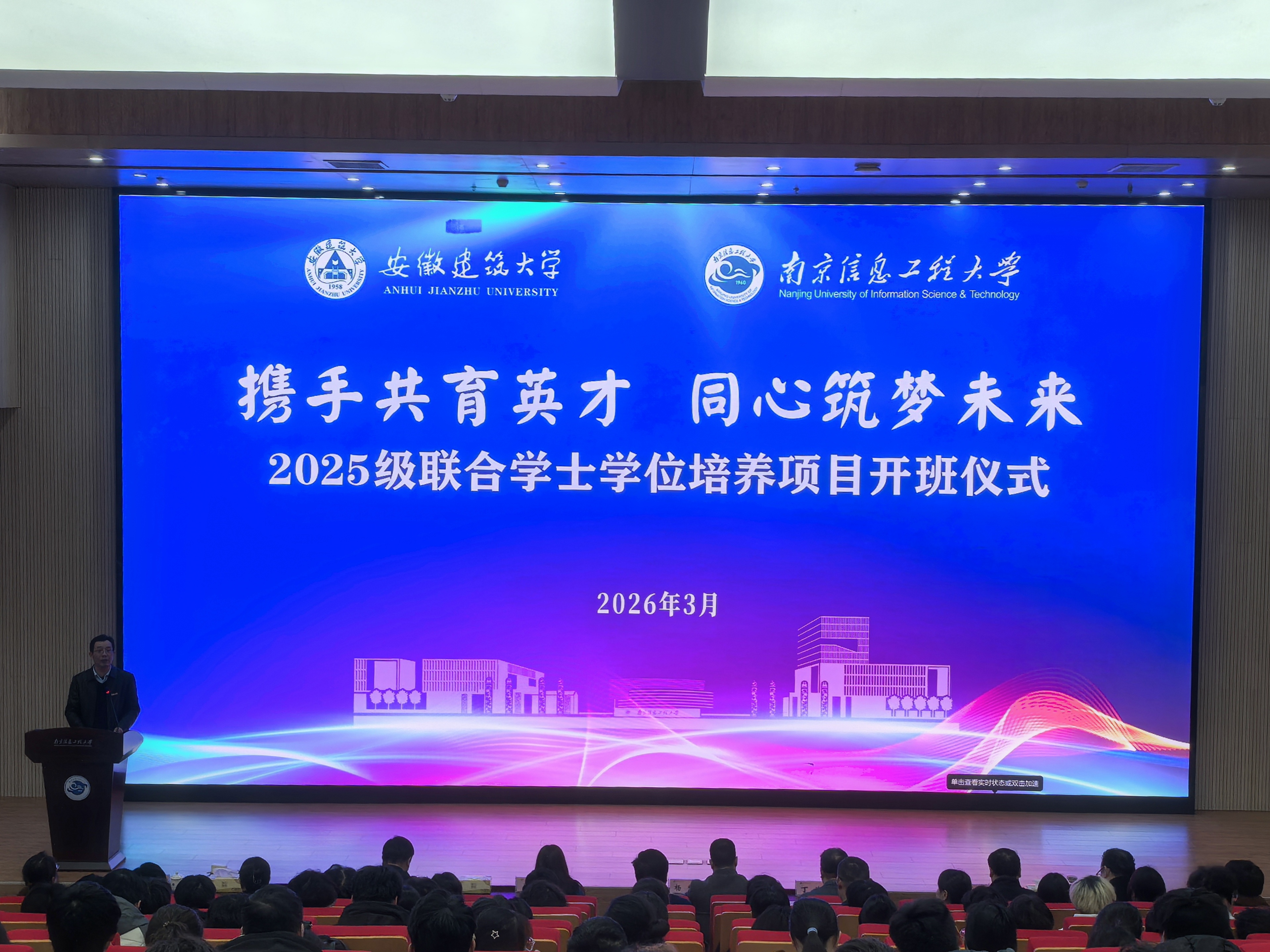 本网讯 3月18日,beat365在线唯一官网-南京信息工程大学2025级本科生联培班开班仪式在滁州天长金牛湖产教融合园区千秋会堂举行。校党委常委、副校长杨科,南京信息工程大学党委常委、副校长马嫣出席仪式。学校长三角区域高等教育一体化示范区共建办公室、学生工作部、本科生院、研究生院、电子与信息工程学院负责人及工作人员,南京信息工程大学相关职能部门负责人、金牛湖园区管委会有关负责人、教师代表,以及2025级联培班学生参加开班仪式。