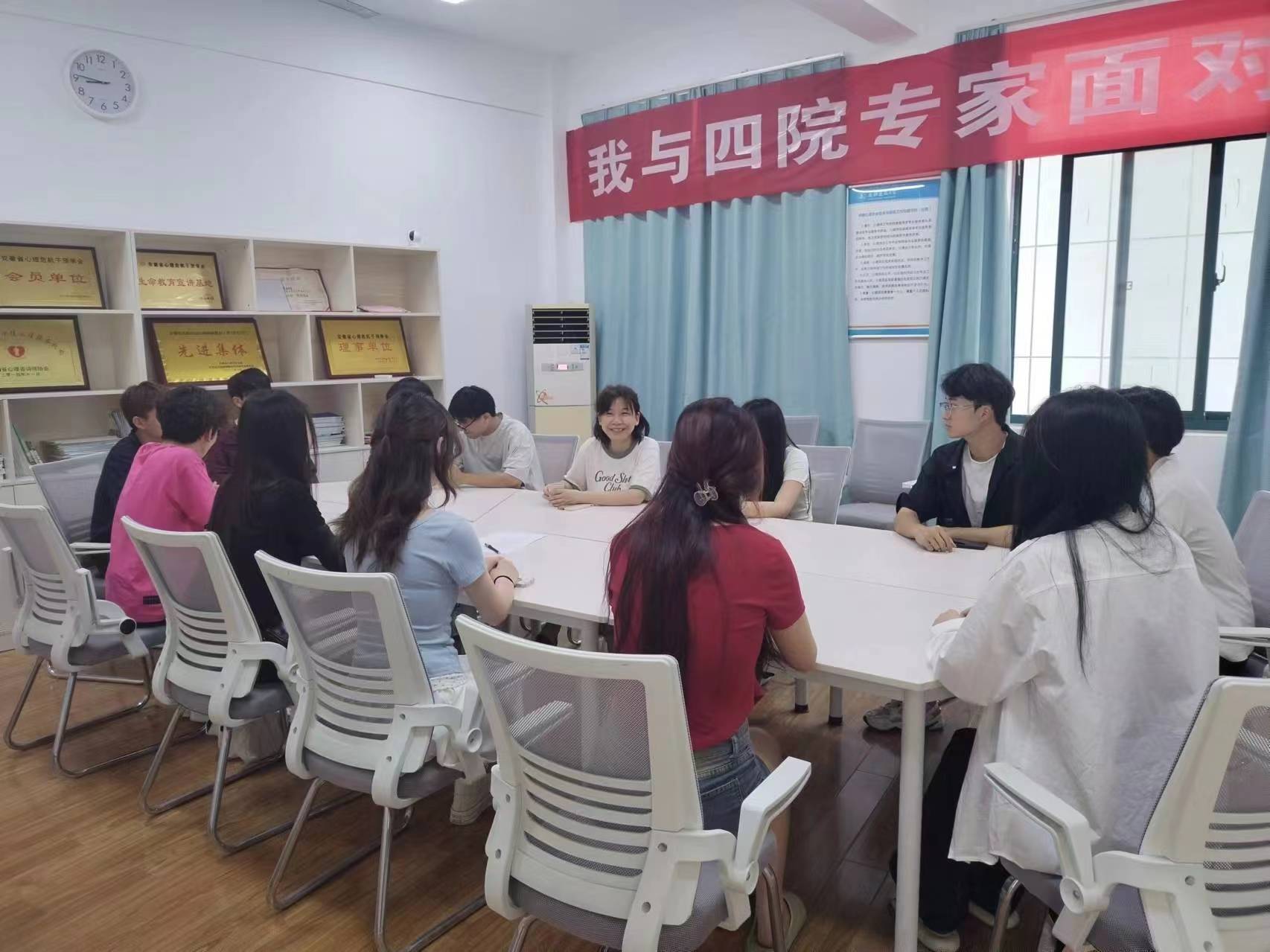 本网讯为了提高大学生的心理素养,,引导大学生树立积极、乐观、健康的生活态度,正确应对学习、生活中的挫折和挑战,进一步提升辅导员的心理育人能力,5月22日,本学期第八期“我与四院专家面对面”活动在心理健康中心如期举办。