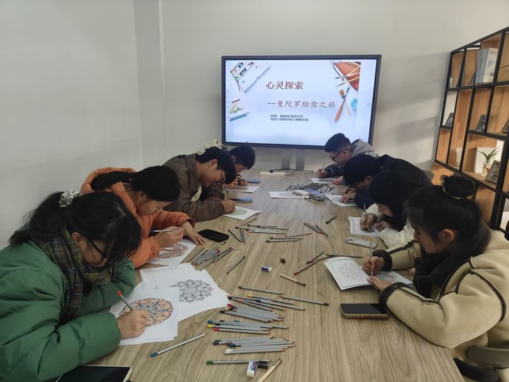 本网讯 为了帮助同学们探索内心世界、提升自我认知,有效调节情绪、缓解压力,12月11日下午,一场别开生面的“心灵探索·曼陀罗绘愈之旅”在金寨路校区F305教室成功举办。活动伊始,主持人首先向同学们介绍了曼陀罗绘画的历史背景和基本原理,强调了它在心灵成长和情绪调节方面的独特作用。随后,同学们纷纷拿起画笔,开始创作属于自己的曼陀罗作品。