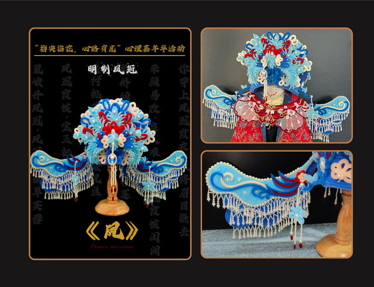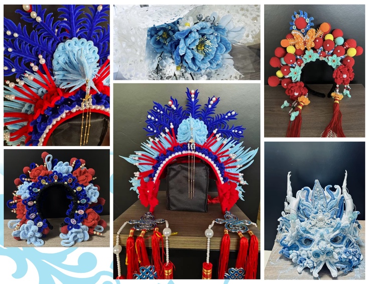 作品明制凤冠通过红、白、蓝三种主色调的精妙配合,融合了扭扭棒、布料等多种材料,成功呈现了明代凤冠的华丽与典雅。不仅展现了学生对中华民族优秀传统文化的理解和感悟,也反映了他们在创作中进行自我认同与情感释放的过程。每一次细致的构建、每一个细节的雕琢,都是对艺术与情感的深度共鸣。