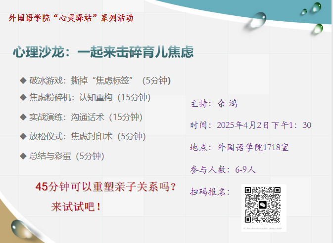 本网讯 为缓解教职工在育儿过程中的心理压力,提升家庭教育质量,4月2日下午,外语学院“心灵驿站”在学院会议室举办了一场主题为“击碎育儿焦虑”的心理沙龙活动。活动特邀学院党总支书记余鸿担任主讲,若干名教职工积极参与。