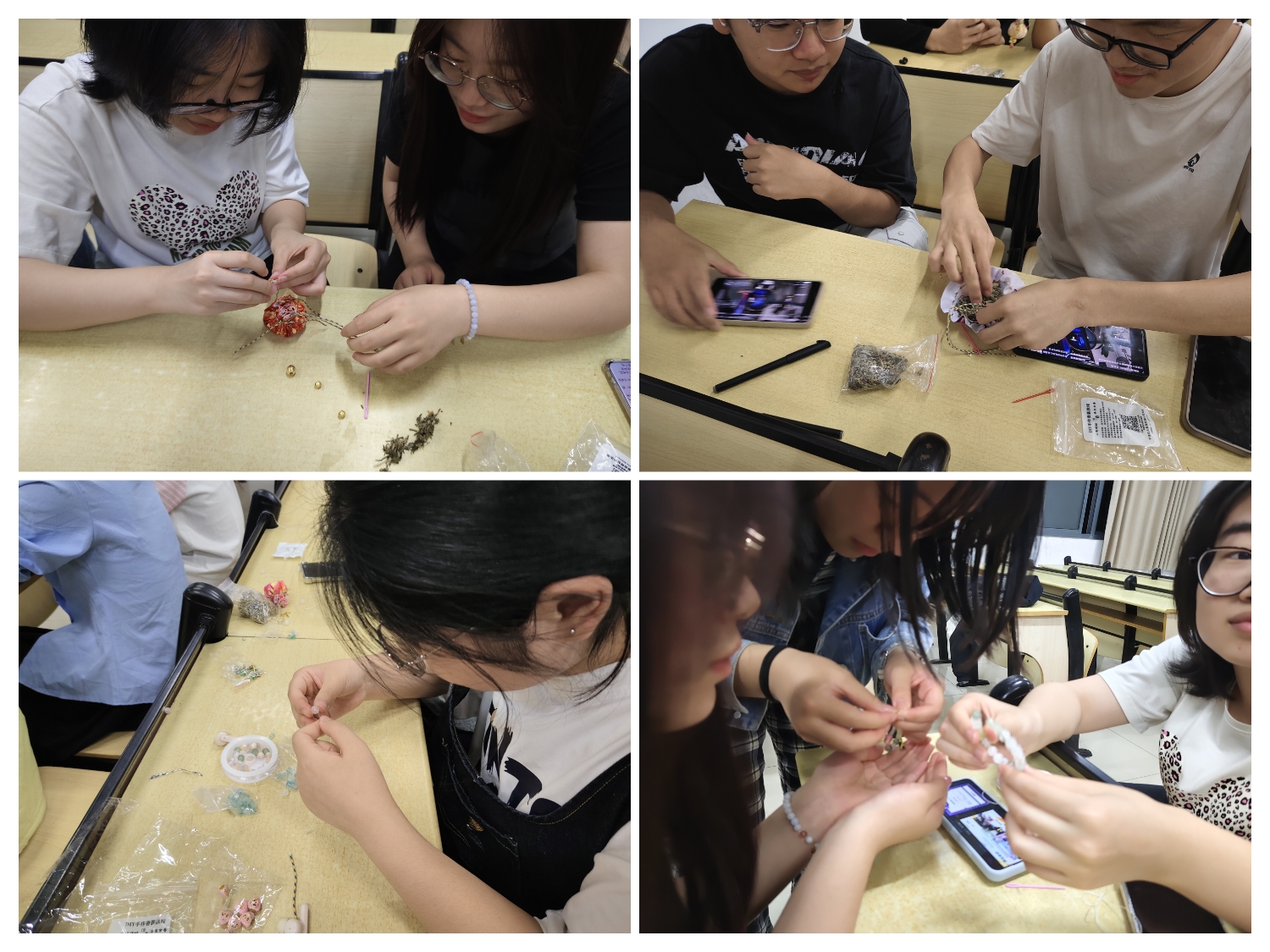 为丰富校园文化生活,将传统节日文化内涵与心理健康服务相结合,学院在逸夫楼508教室举办了“巧手制香囊,五彩迎端午”心理减压手作活动,吸引了众多学生参与。活动现场,同学们在轻松愉快的氛围中围坐一起,在领取彩线、布料、香料等材料后,积极投入到手作创作中。有的同学专注缝制香囊外袋,有的精心编织五彩手绳,还有的巧妙搭配珠串进行装饰。大家通过分工协作,共同完成了一件件富有创意与匠心的作品。