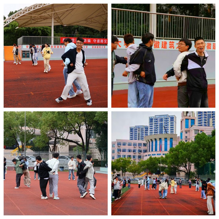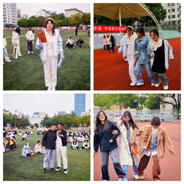 作为此次团辅活动的压轴环节,“绑腿赛跑”进一步考验着新生的团队协作能力。3人一组的新生,需将相邻两人的腿绑在一起,共同向50米外的终点迈进。赛前,各小组围在一起商讨策略:有的用口号统一节奏,有的则主张以稳致胜。比赛中,部分小组虽出现步伐错乱,甚至有人摔倒,却没有一名同学放弃,大家互相鼓劲后迅速调整,重新向终点进发。当各组相继冲过终点线时,全场爆发出热烈的掌声与欢呼,同学们脸上洋溢着成功的喜悦,更深刻感受到了团队的温暖。