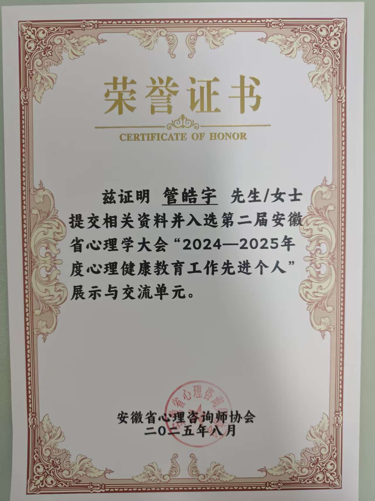 管皓宇老师荣获心理健康教育工作先进个人