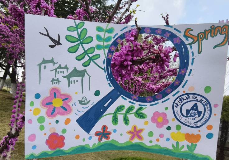活动以汉字“春”为创意核心,鼓励同学们亲手制作镂空“春”字卡片,将校园春日盛景嵌入字间,以“字为框、景为画”的独特形式,定格春日美好。同学们走出宿舍、走进自然,在樱花、海棠、玉兰、杜鹃等春日繁花间取景创作,用画笔、手工与镜头,将汉字之美与自然之韵融为一体。一张张创意作品既展现了外院学子的审美创造力,也让同学们在亲近自然、动手创作的过程中舒缓了学业压力,放松了身心,实现了美育浸润与心理疏导的双向赋能。