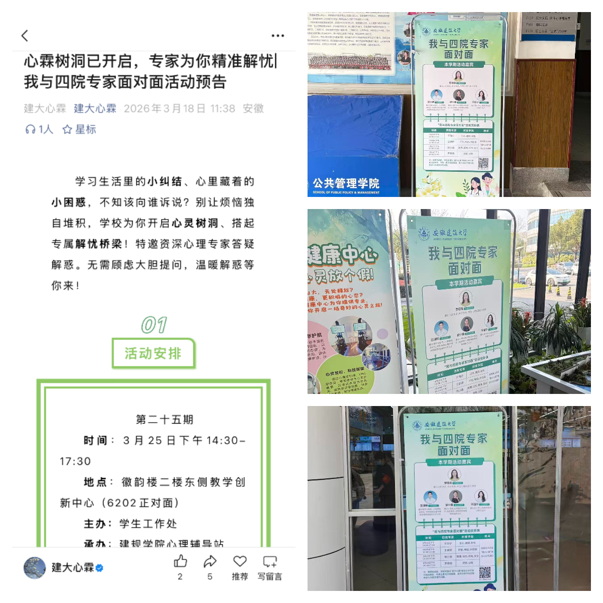 为提升活动知晓度与参与度,学校在活动前期精心设计并制作了“我与四院专家面对面”主题宣传展架,在学校南北校区各教学楼、宿舍和食堂入口处进行摆放,有效营造了关注心理健康的良好氛围,吸引了众多同学的关注。同时,依托“建大心霖”微信公众号“心霖树洞”栏目,广泛征集同学们在人际交往中面临的现实困惑。这些来自“树洞”的真实诉求,直接构成了本次专家现场交流的核心议题,确保答疑的针对性与代表性。