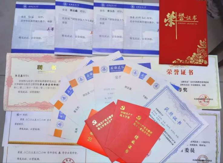 桌面布满的奖状、证书,更是三年来赢取的功勋;大学生职业规划大赛、大学生创新创业大赛都留下了属于他们的脚印;党课结业证书、学生会部长聘书,是他们全面发展的足迹;奖学金、荣誉证书,是对他们努力的表彰,他们不仅懂学习会学习,更够努力够出彩。这些荣誉是他们共同参赛、共同思考、共同赞扬,留下的彼此痕迹。也许多年后,再次拿起这份证书、奖项,脑海中的回忆却是那身边人的坚定支持,这才是时间的馈赠。