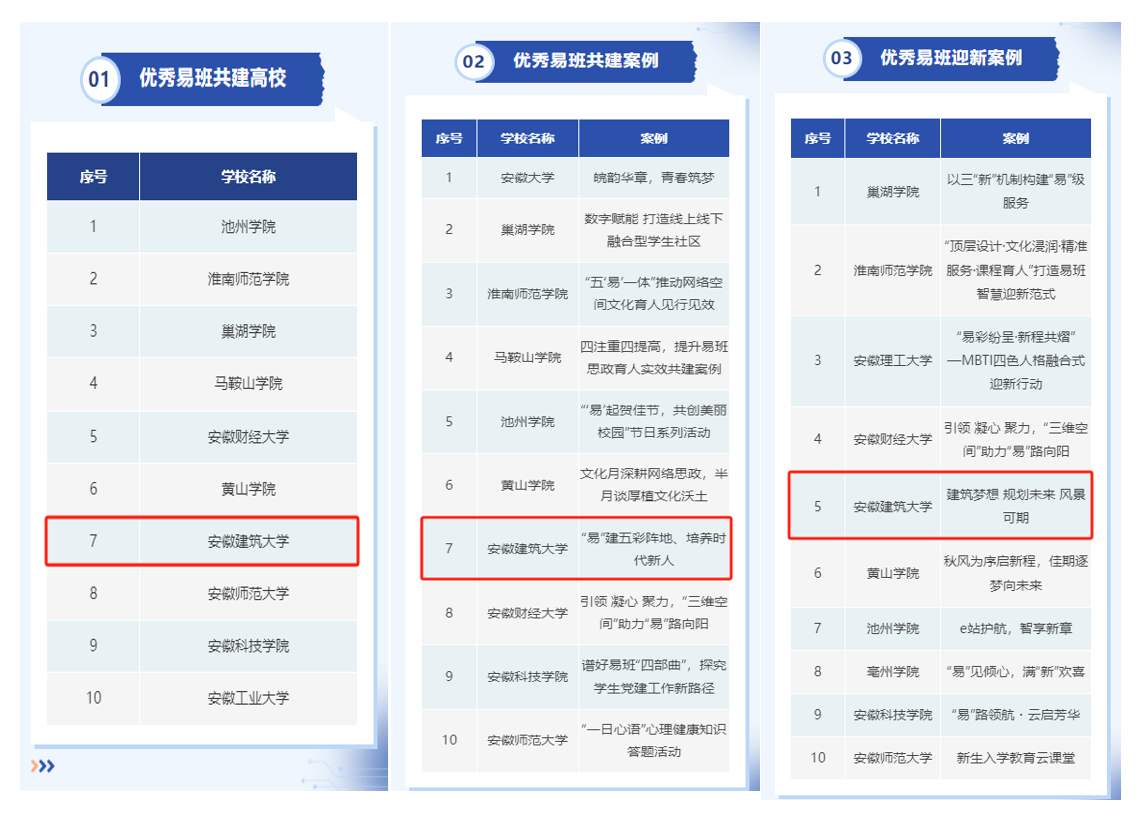 本网讯 近日,安徽省高校网络思想政治工作中心、安徽省高校易班发展中心组织开展了2024年度安徽省高校易班共建工作评优活动。学校在此次评优中取得佳绩,获得了“优秀易班共建高校”“优秀易班共建案例”“优秀易班迎新案例”“优秀易班指导教师”“优秀易班辅导员”多项荣誉。