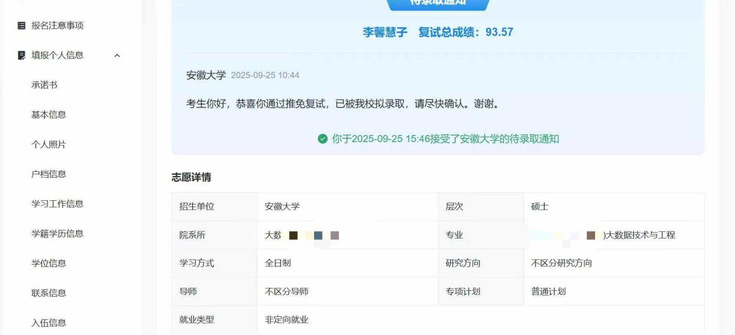 一路深耕终有收获,凭借学业、实践、素养的全方位硬核实力,李馨慧子顺利通过考核,成功保研至安徽大学大数据技术与工程专业。回望保研之路,她始终心怀感恩,深知成绩的取得离不开良师益友的鼎力相助与亲朋好友的默默支持。老师的课堂解惑、项目点拨与方向指引,帮她避开弯路;伙伴们在项目研发中的并肩攻坚、备赛途中的互帮互助,让奋斗时光更有温度;亲朋好友的无条件支持,是她直面挑战的坚实后盾。这份感恩之心,化为她奔赴未来的底气与力量。