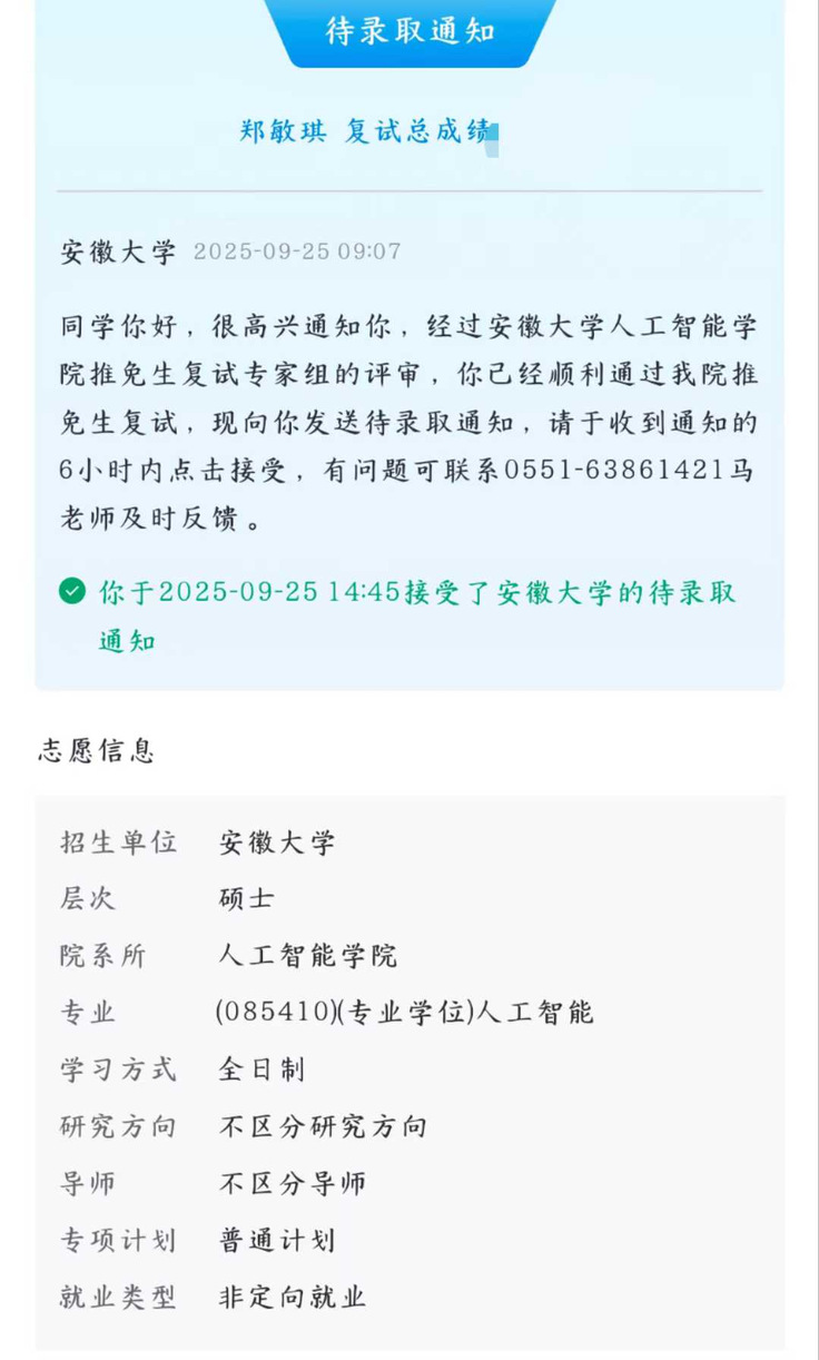 回顾本科阶段,她坦诚地说,自己在竞赛与科研方面仍有一些遗憾,尚未完全挖掘出全部潜力。也正因如此,她对即将在人工智能领域展开的研究生生活充满期待。面对新阶段、新赛道,她希望把本科阶段打下的扎实理论基础迁移到更前沿的科研实践中,在人工智能的“新蓝海”里持续深耕、弥补短板、迎接更高层次的挑战。
