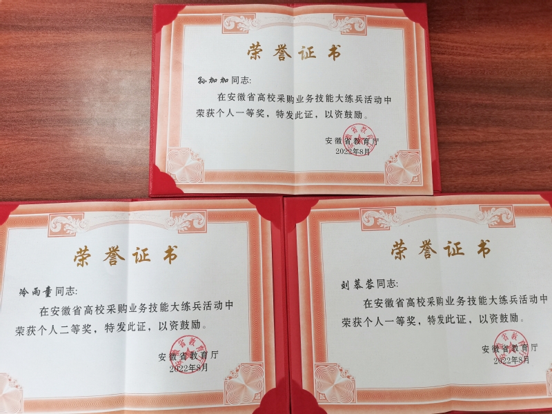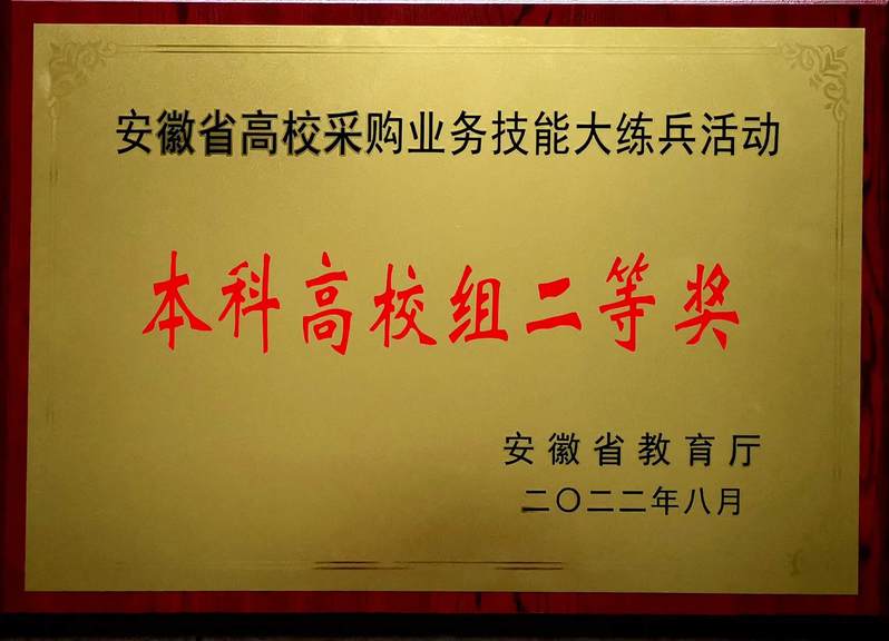 2022年8月,招投标管理办公室主任王祥贵带领孙加加、刘慕蓉参加安徽省教育厅主办的首届安徽省高校采购业务技能大练兵活动并获得本科高校组二等奖,其中孙加加、刘慕蓉获得个人组一等奖,冷雨童获得个人组二等奖。