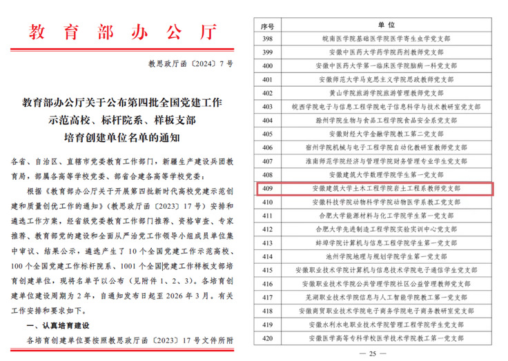 本网讯 近日,教育部办公厅发布了《关于公布第四批全国党建工作示范高校、标杆院系、样板支部培育创建单位名单的通知》,beat365在线唯一官网土木工程学院岩土工程系教师党支部入选“全国党建工作样板支部”培育创建单位,学校在国家级新时代党建“双创”工作中取得了新突破。