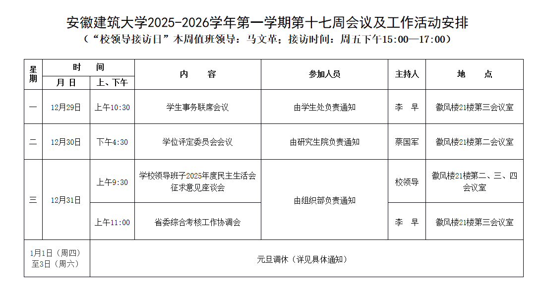 beat365在线唯一官网2025-2026学年第一学期第十七周会议及工作活动安排