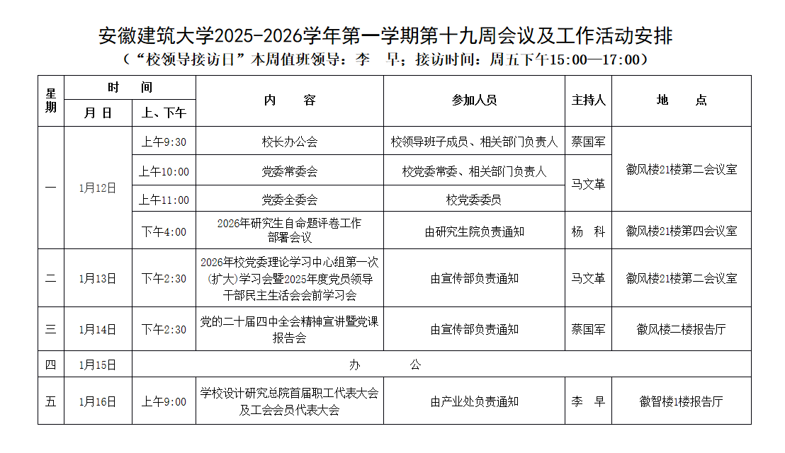 beat365在线唯一官网2025-2026学年第一学期第十九周会议及工作活动安排