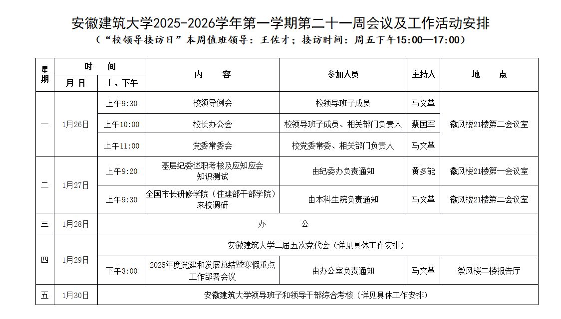 beat365在线唯一官网2025-2026学年第一学期第二十一周会议及工作活动安排