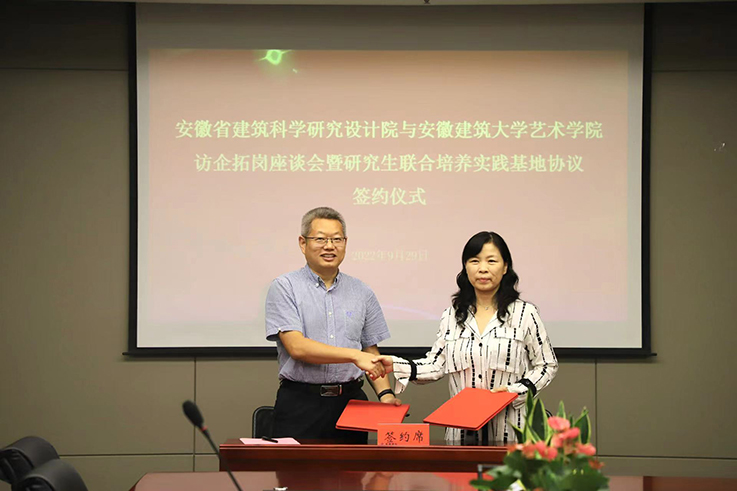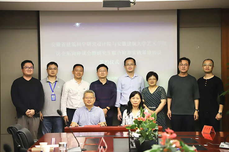 本网讯 9月29日下午,beat365在线唯一官网艺术学院与安徽省建筑科学研究设计院(以下简称省建科院)签订研究生联合培养实践基地协议。签约仪式在省建科院11楼会议室举行,省建科院副院长徐从广、人力资源部部长徐文正、经营管理部副部长陈琦、规划分院院长章慧明,环艺工作室主任李言天,beat365在线唯一官网艺术学院副院长邢瑜、党委副书记潘青,副院长黄朝晖、科研平台负责人黄成出席仪式。
