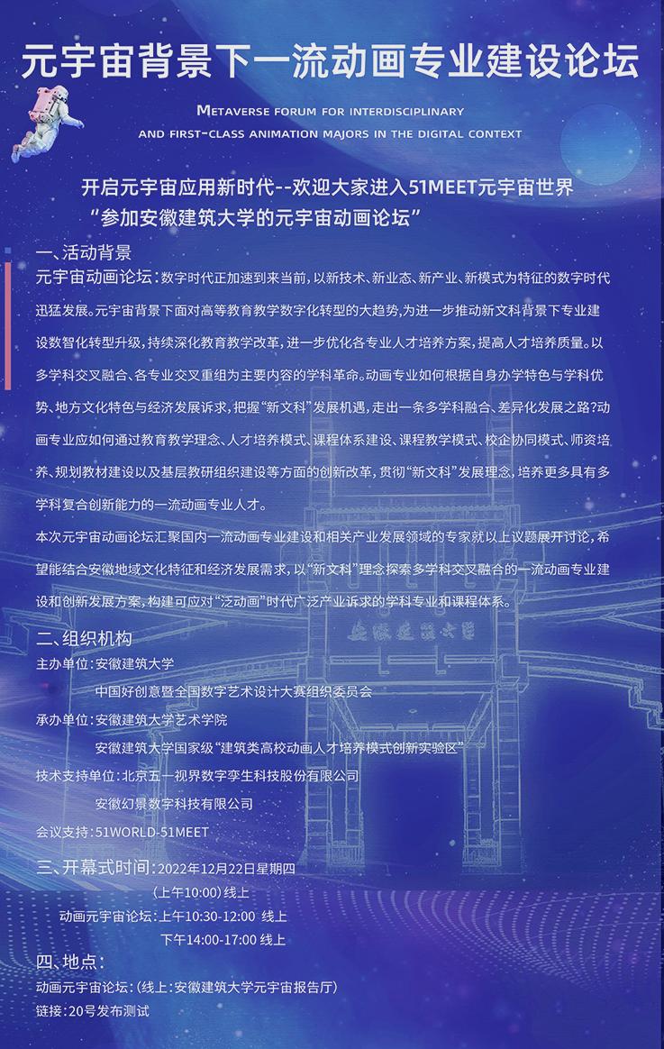 本次全国论坛由我院与中国好创意暨全国数字艺术设计大赛组委会共同主办。会议创新采用“元宇宙”线上会议的形式,开启了元宇宙应用新时代,相关元宇宙技术由北京五一视界数字孪生科技股份有限公司、安徽幻景数字科技有限公司提供协助,是“51MEET元宇宙”平台首次在安徽高校使用。