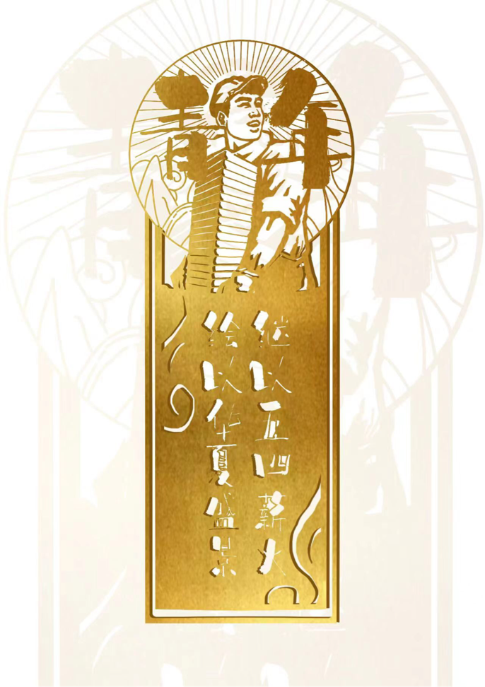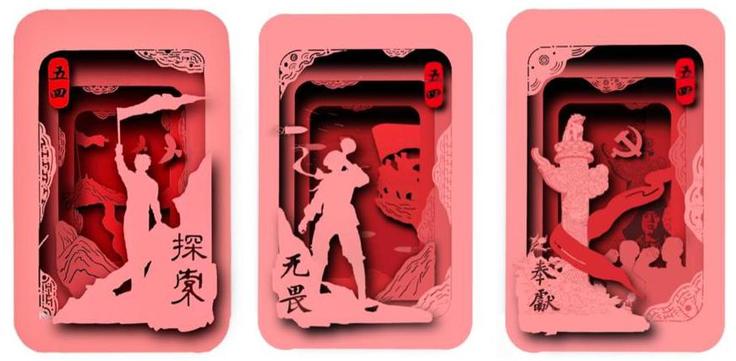 22级视觉传达专业1班黄康采用非遗纸雕的工艺技法,以红色为主色调,展现出热血沸腾、气势磅礴的视觉效果,创造出独具特色的“五四”印记。