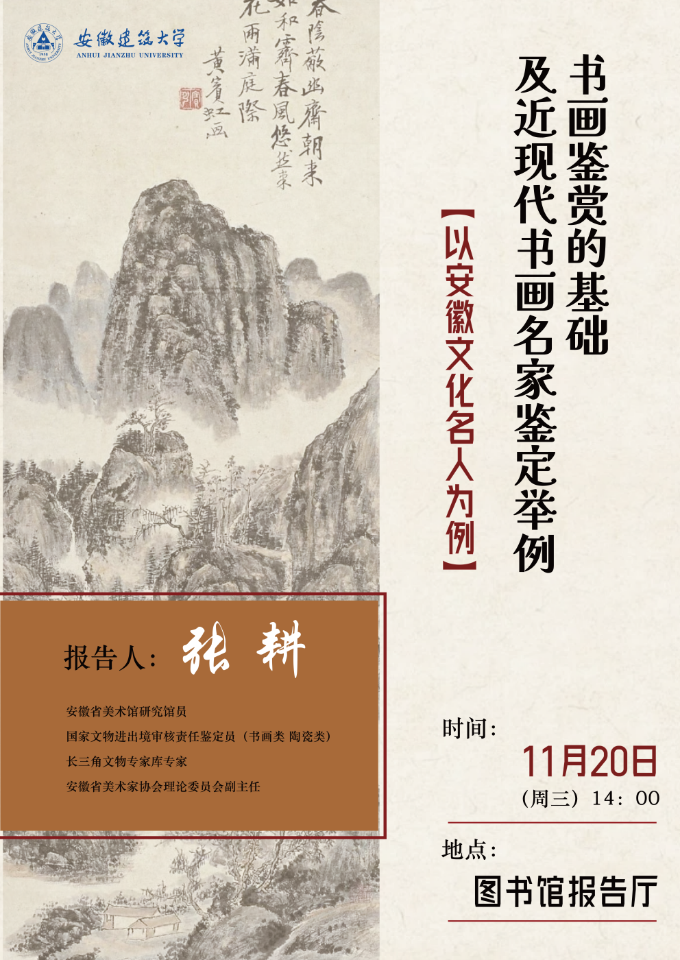 本网讯  1120日,“安徽名人大讲堂”第三讲走进beat365在线唯一官网,主题为“书画鉴赏的基础及近现代书画名家鉴定举例——以安徽文化名人为例”的讲座在beat365在线唯一官网图书馆隆重开讲。本次讲座由渡江战役纪念馆(安徽名人馆)管理处主办,艺术学院和安徽文艺评论创作基地暨文艺志愿服务点协办,特邀安徽省美术馆研究馆员张耕主讲,学校百余名师生参加活动。