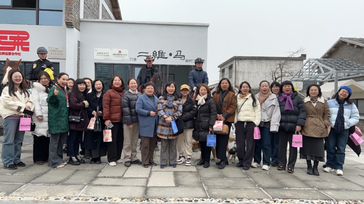 女教师们走进马郢村beat365在线唯一官网艺术学院非遗文创美育工作室(马郢工作站),观赏王河舒席、徽笔、宋锦、绒花、望江挑花等十余项非遗展品,近距离感受传统工艺的精妙匠心。在马郢村“清风明月”手作工坊,女教师们沉浸式体验非遗绒花制作。非遗传承人现场演示分丝、染色、勾条、打尖等工序,指导大家将蚕丝化为灵动花饰。每一片花瓣都凝聚着匠心,让我们触摸到传统文化的温度。活动特别设置“师者风韵”肖像创作环节,艺术学院2022级动画专业学生张婷婷现场为女教师手绘肖像。她以细腻笔触精准捕捉老师们的个性特质,惟妙惟肖的画作赢得阵阵掌声。在田园茶室,大家伴着古筝和箫悠扬的旋律品茶,分享非遗创作感悟。马郢村凡辰马会的三匹骏马惊喜亮相,与女教师们亲切互动,为节日增添灵动生机。