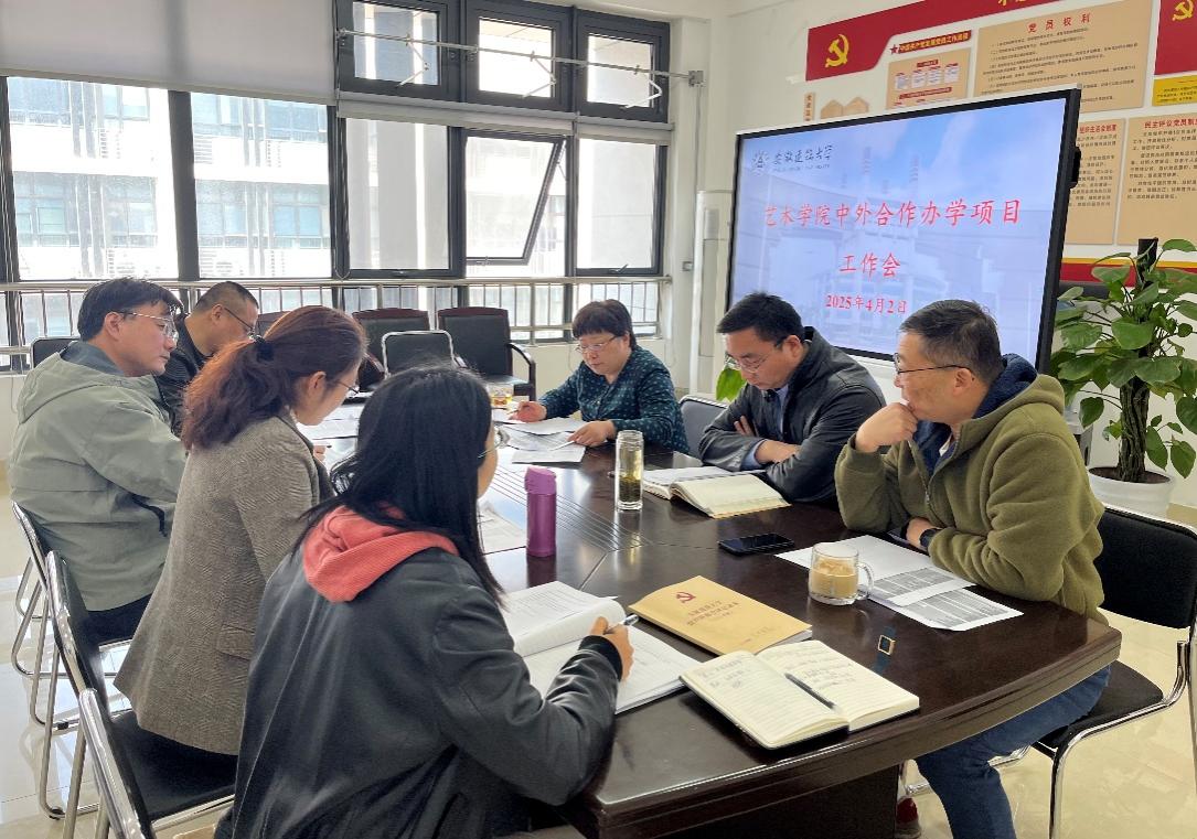 本网讯  近日,艺术学院召开中外合作办学项目工作会议,对近期中外合作办学相关工作展开研讨。会议由学院党委副书记(主持工作)潘青主持,学院领导班子成员、教授代表、环境设计中外合作部主任张明明及中外合作办学项目协调员雷媛参加会议。