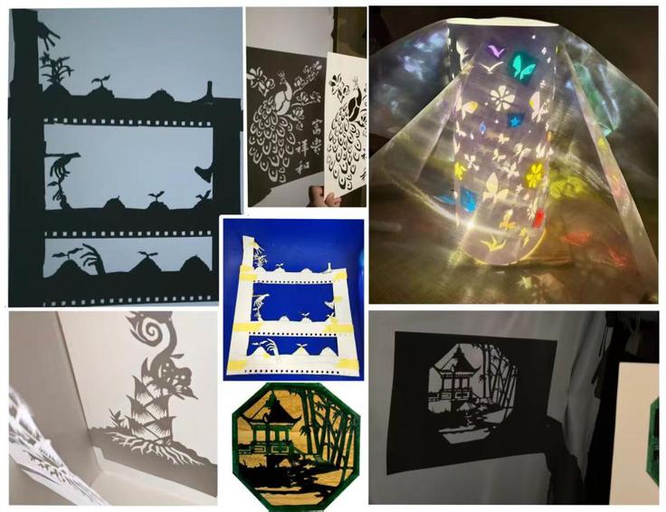 同学们踊跃参与,发挥奇思妙想,在纸板上精心镂空、绘制出如向阳绽放的向日葵、振翅逐光的蝴蝶、破土而出的新芽、缀满晨露的雏菊等充满积极向上意蕴的自然图案,围绕“捕捉自然生命力”的核心主题,利用手机作为光源、硬纸板作为投影板、马克笔进行绘制,亲手制作简易投影装置诠释“追光而生”、“新生向上”等主题。通过不断调整手机的角度与投影距离,一幅幅生动而富有感染力的光影图案清晰地呈现在墙面或幕布上,展现了自然元素的鲜活细节与盎然生机,充分体现了现代科技与艺术表的有机融合。
