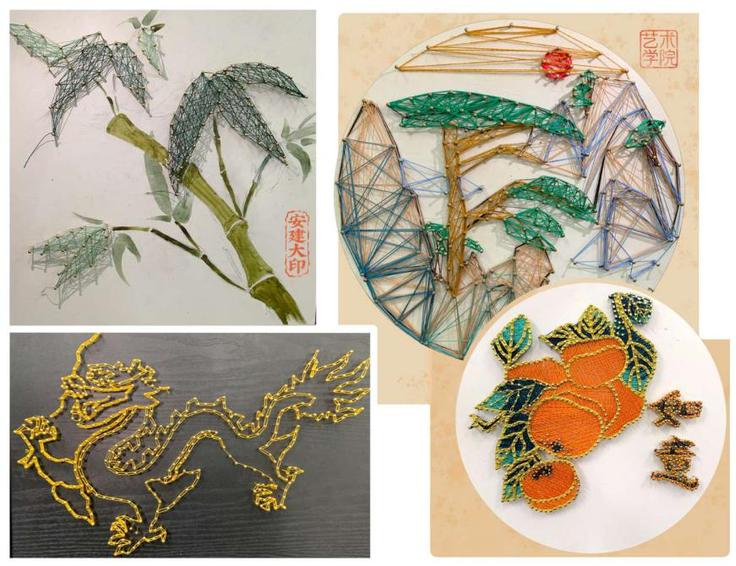 钉子绕线创意表达活动是一堂兼具审美培育与价值引领的生动思政课。同学们在创作中深刻感受祖国山河的雄伟瑰丽,在经纬交错间锤炼耐心与专注,在点线面的组合中提升对几何之美的理解能力,以实际行动传承工匠精神,充分展现了设计创意学院学子将专业特长与爱国情怀、动手能力相结合的综合素养,表达了对伟大祖国热爱与祝福。(作者:孙长玥 徐紫娴 李璐;一审:施林坡;二审:任磊;三审:潘青)