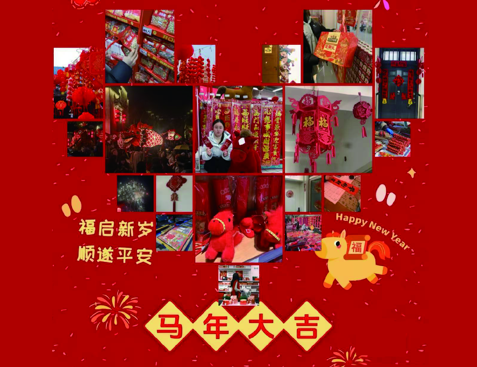 年味打卡活动面向全院学生征集承载新春喜悦与美好期许的瞬间,大家将作品上传至专属小程序,共同拼接出创意满满的马年心形照片墙,定格温暖时光的同时,传递“龙马精神、马到成功”的新春祝愿。同学们积极分享和家人逛市集、挑春联、选马年主题装饰的欢乐场景,家中满置年货、创意布置马年摆件的温馨画面,全家齐心扫屋贴福、备腊味做年饭的团圆时刻,手写心愿清单、精挑新年礼物的期待瞬间,以及帮长辈贴春联、为邻里送福字的暖心举动,尽显新春氛围与亲情暖意,更让中华传统美德在年味传递中得以传承。