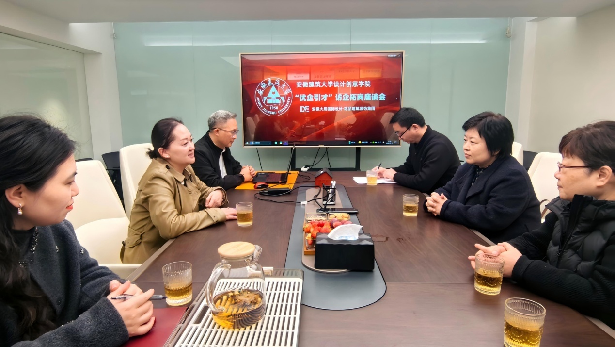 在安徽中树建筑装饰工程有限公司,校企双方开展座谈交流。设计创意学院党委书记潘青介绍了学院专业设置、人才培养特色以及2026届毕业生的生源情况.企业负责人介绍了公司的发展历程、业务板块、人才需求现状以及今年招聘形势。李早希望进一步深化校企合作,结合企业发展需求,鼓励建大学生在企业实践、就业,实现校企双赢。