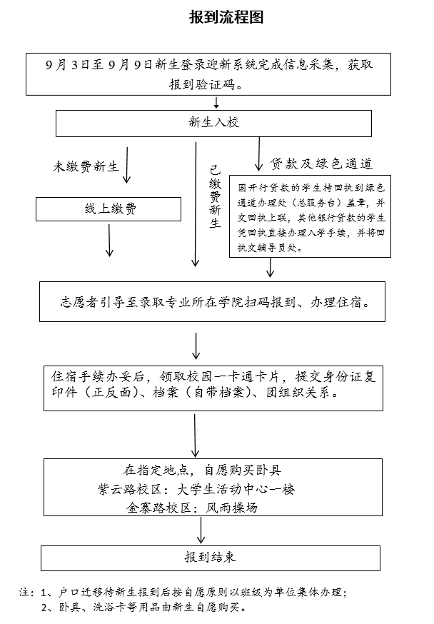 报到当天紫云路南大门临时交通管制,仅供新生及家长步行进校,所有车辆均不得进入(包括本校教职工车辆,报到当天主干道两侧设置接待处及各类社团迎新处等,人流密集,车辆无法通行;校门外届时车辆高度密集,往年一公里左右均无停车位置,建议开车家长提前查找远处停车场,并自带小推车;卧具等沉重物品建议快递到校)。