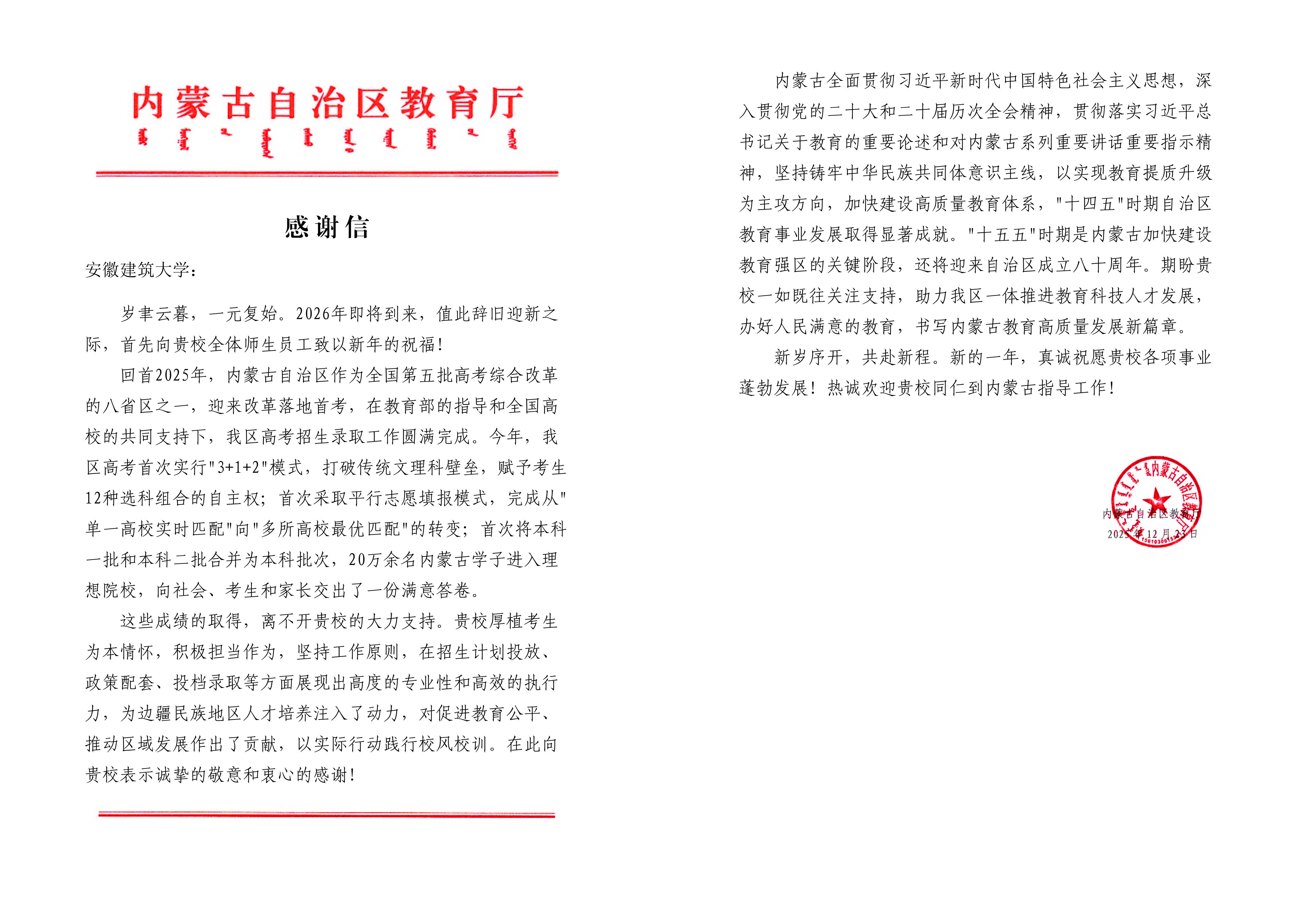 本网讯 近日,内蒙古自治区教育厅向beat365官网专程发来感谢信,对beat365官网在内蒙古高考综合改革落地首年给予该区的招生计划投放、科类专业设置、投档录取和考生服务等各方面支持表示衷心感谢,对beat365官网助力边疆民族地区人才培养、促进教育公平和推动区域发展的长期贡献表达诚挚敬意,对beat365在线唯一官网全体师生员工致以新年的祝愿。